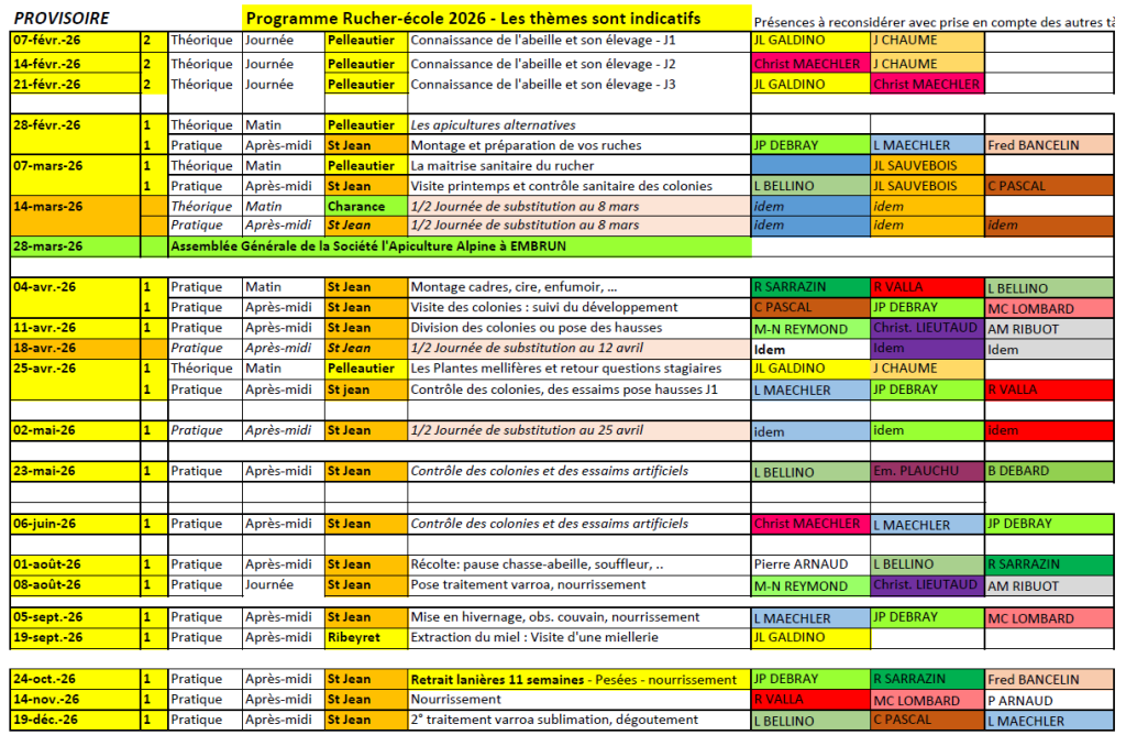 Les cours théoriques et pratiques, qui se dérouleront au rucher école de Gap pour les cours pratiques (27 demis journées). Ces cours seront dispensés selon le calendrier ci-dessous. Il s’agit d’un calendrier de principe qui reste modifiable en raison du développement des colonies et des aléas climatiques …Nous avons prévu des séances de rattrapage si le temps ne nous permet pas de faire les séances. De plus vous avez les numéros de téléphone ou le mel pour vous renseigner.